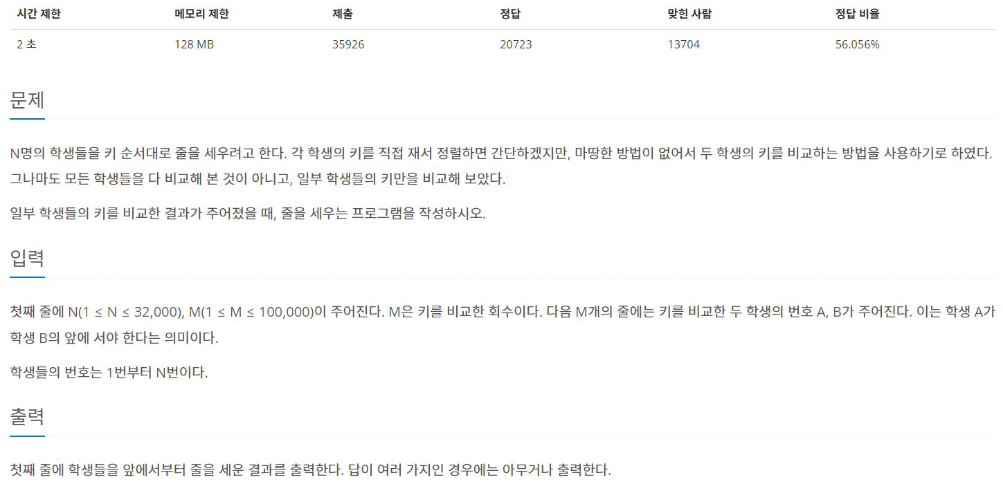 첫째 줄에 N(1 ≤ N ≤ 32,000), M(1 ≤ M ≤ 100,000)이 주어진다. M은 키를 비교한 회수이다. 다음 M개의 줄에는 키를 비교한 두 학생의 번호 A, B가 주어진다. 이는 학생 A가 학생 B의 앞에 서야 한다는 의