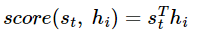 여기서 예측 단어를 출력하려는 디코더의 은닉 상태와 모든 인코더의 은닉 상태와 내적을 진행해줍니다.