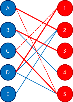 B를 2와 매칭시키려했는데 이미 A가 차지했네요. 이런 경우는 이전에 매칭됐던 A가 양보를 해줍니다.