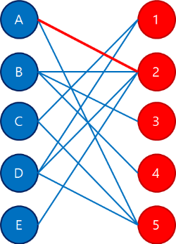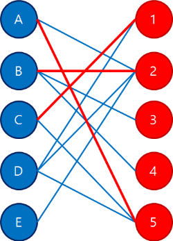 따라서 A는 5와 매칭이 되고, B는 2와 매칭할 수 있게 됩니다.