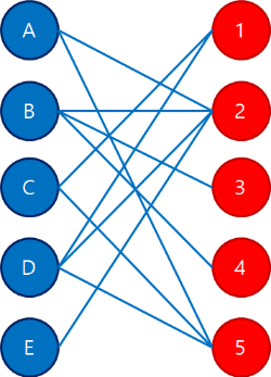 이분매칭 알고리즘이란? 2개의 정점 그룹이 있을 때, 그룹에서 그룹으로 정점의 최대 매칭을 찾는 알고리즘입니다. 아래와 같은 두 그룹의 정점이 있다고 합시다. 각 그룹을 연결할 수 있는 간선의 정보입니다. A: 2, 5 B: 2, 3, 4 C: 1, 5 D: 1, 2, 5 E: 2 위 간선들 중에서 정점을 한 번만 사용해서 최대 매칭을 이룰 수 있게 만드는 것이 이분매칭 알고리즘의 목적입니다. 알고리즘은 깊이 우선 탐색(DFS)로 진행이 되며, 과정은 아래와 같습니다. 우선 A와 매칭이 가능한 1을 매칭 시킵니다. 현재 연결 정보 A -- 2 B -- C -- D -- E -- A는 매칭했으니 B를 보도록 합시다. B를 2와 매칭시키려했는데 이미 A가 차지했네요. 이런 경우는 이전에 매칭됐던 A가 양보를..